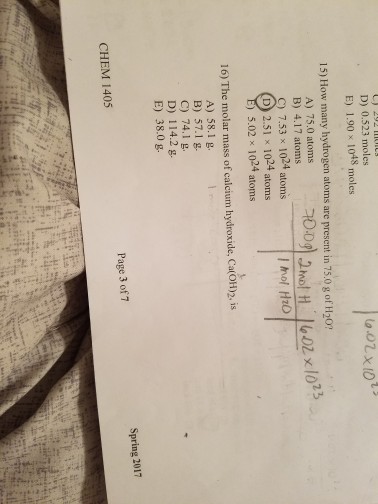 135 103 moles e. 18 A 750 moles B 135 x 10 3 moles C 441 moles D 417 moles E 750 moles B 417 moles. How many moles of water H2O are present in 750 g H2O.